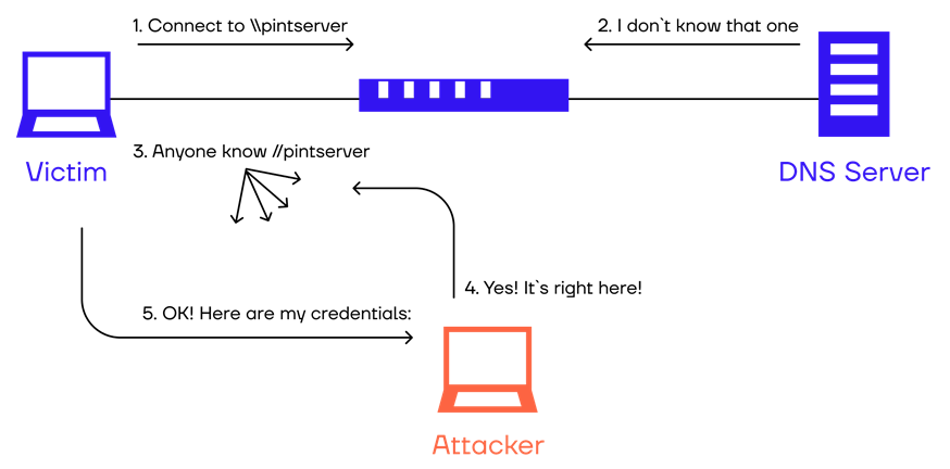 В момент получения запроса LLMNR/NBT-NS можно подделать реальный источник разрешения имен в сети. Он отвечает на трафик так, как будто ему известна личность запрашиваемого узла: отправляет службу, чтобы жертвы общались с контролируемой системой.