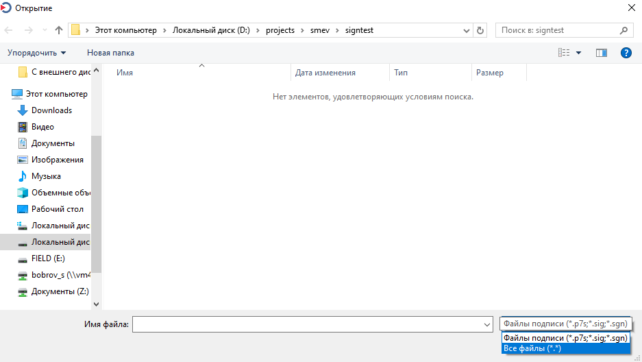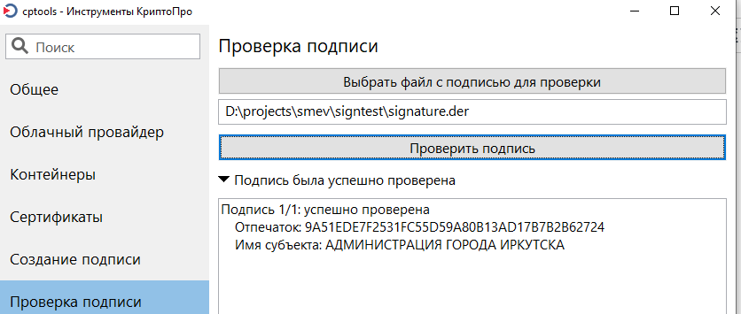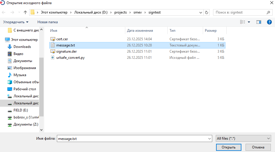 Нажимаем кнопку "Проверить подпись" и будет предложено указать исходный файл (который мы подписывали), так как файл signature.der это файл с открепленной подписью. Указываем message.txt