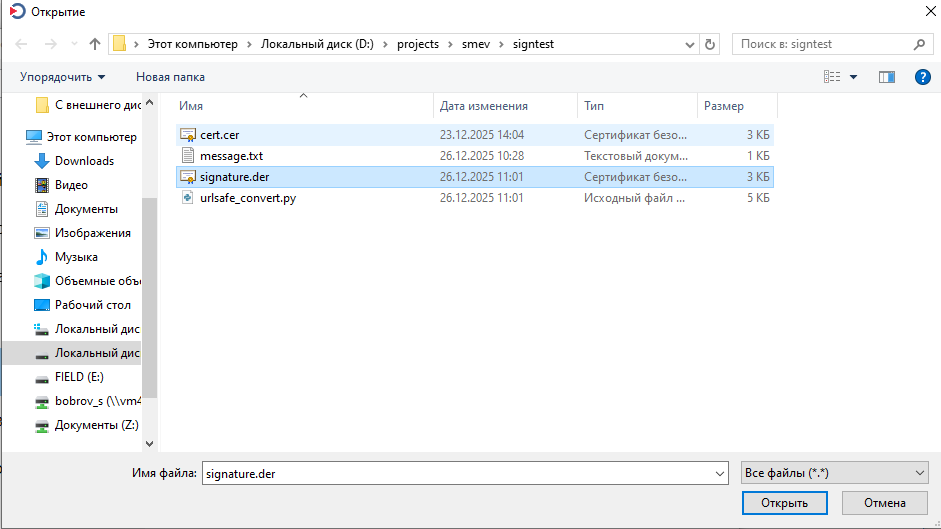 Саму подпись сохраняем в переменную signature_urlsafe. В результате сформируется файл signature.der