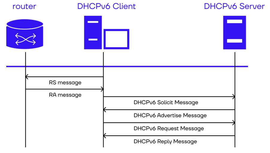 - Клиент Ipv6 посылает сообщение Solicit на адрес All_DHCP_Relay_Agents_and_Servers для поиска доступных серверов DHCP.