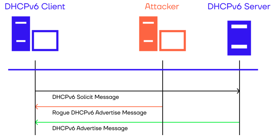 Цель - использование поддельного сервера DHCPv6 для перенаправления трафика жертвы на себя. Перехватывается сообщение клиента DHCP solicit и назначаются учетные данные (например, адрес DNS). Пример работы сети в обычной ситуации: