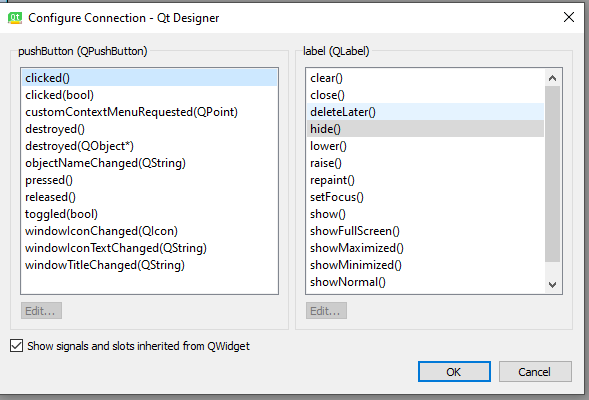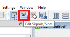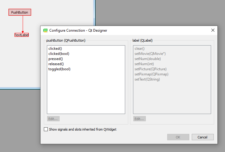 При наведении мыши виджет становится красным. Если нажать виджет, с которого сигнал будет исходить и, удерживая мышь, переместить указатель на виджет, на который будет влиять сигнал, появится стрелка и элемент выбора сигналов/слотов.