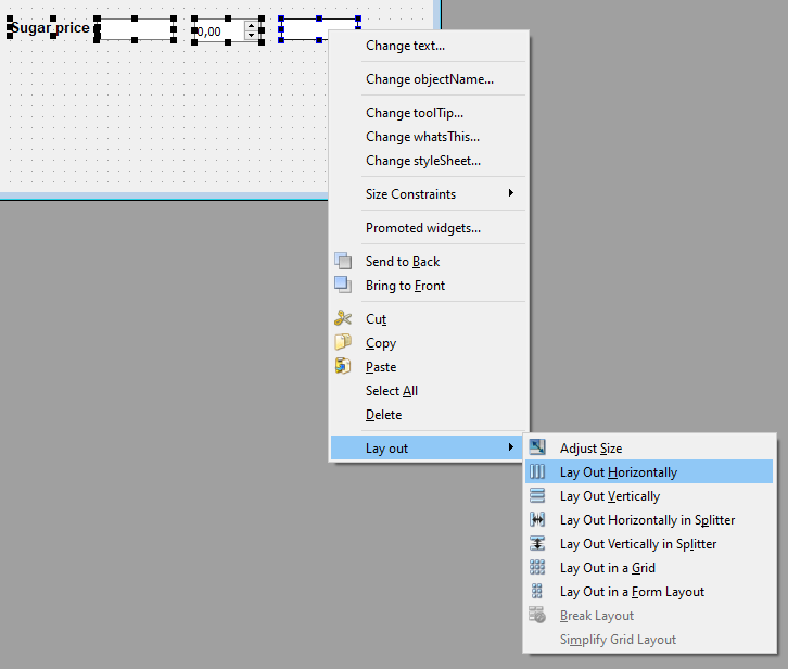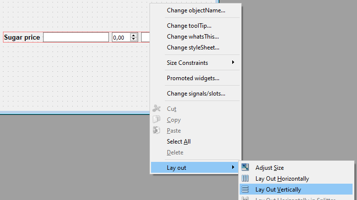 Настройка для группы элементов: выделяются виджеты, ПКМ - Lay Out - Нужный тип.