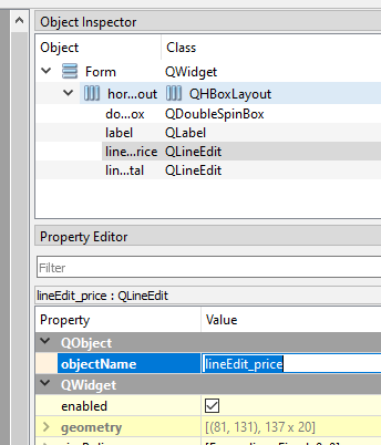 Для дальнейшего доступа к виджетам из py скрипта необходимо знать тип виджета и имя объекта. Например, есть виджет типа QLineEdit, имя объекта lineEdit_price.