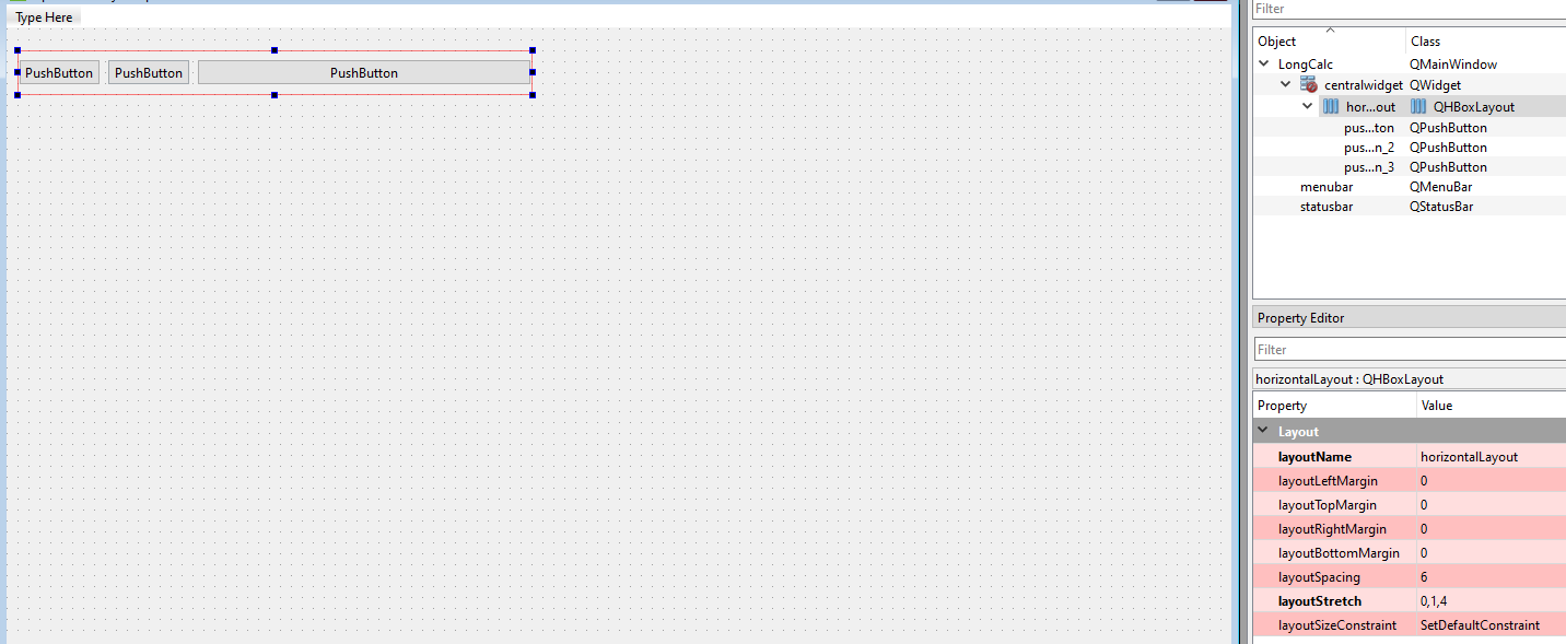 | Horizontal Layout (Горизонтальный компоновщик) | Располагает виджеты слева направо в строку.