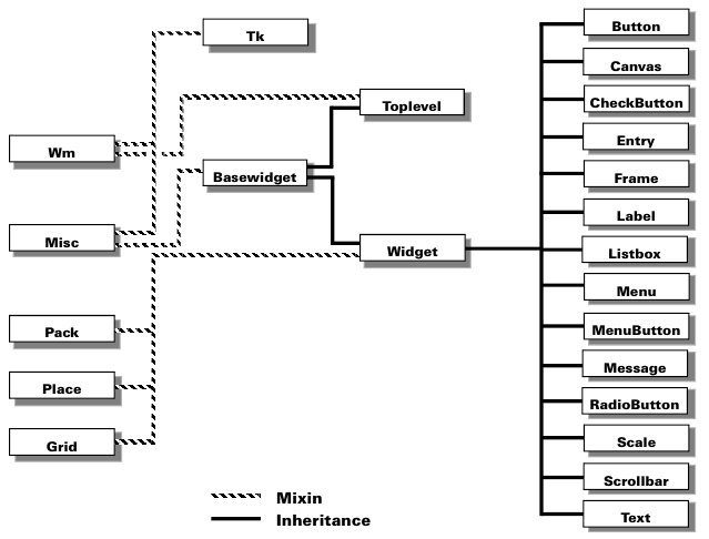Три менеджера геометрии – упаковщик (pack), сетка (grid) и размещение по координатам (place). В одном окне (или родительском виджете) нельзя комбинировать разные менеджеры.